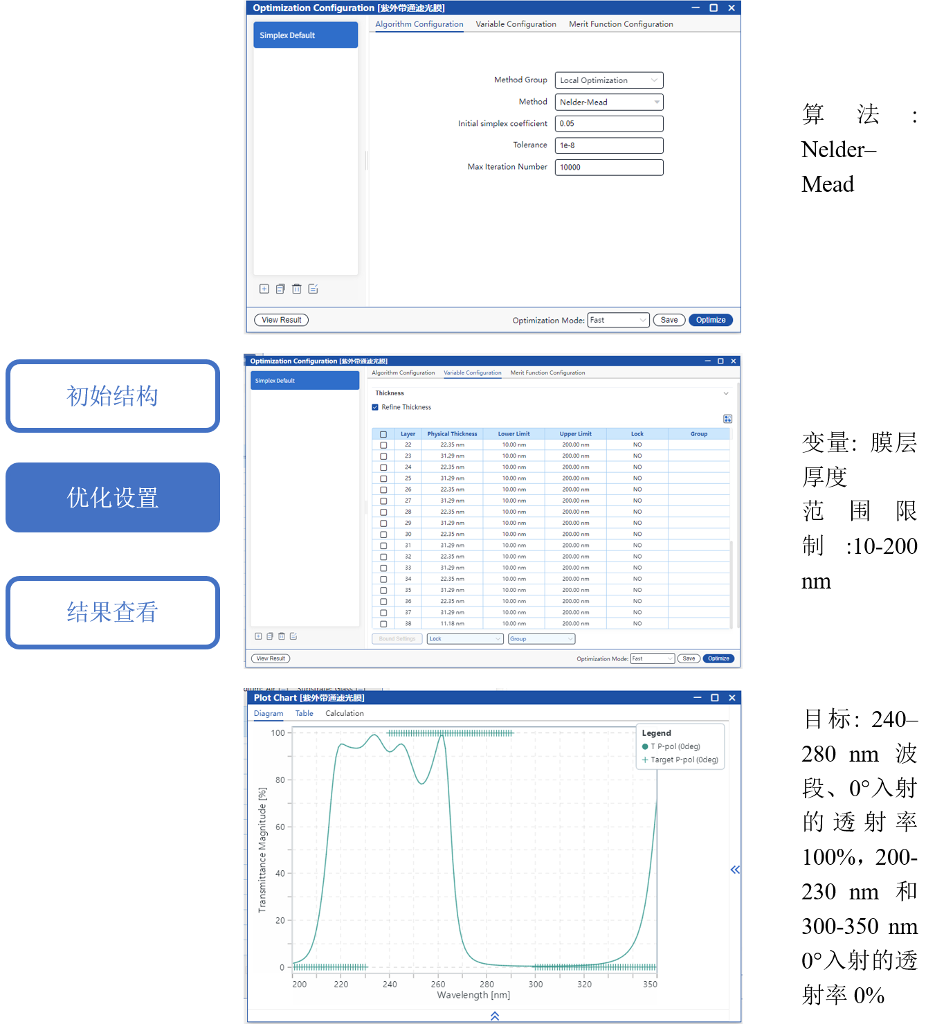 采用 Nelder-Mead 算法對各層厚度進行優(yōu)化,目標是在0°入射是,240–280 nm 波段透射率100%,200–230 nm與300–350 nm 波段透射率低于1%。