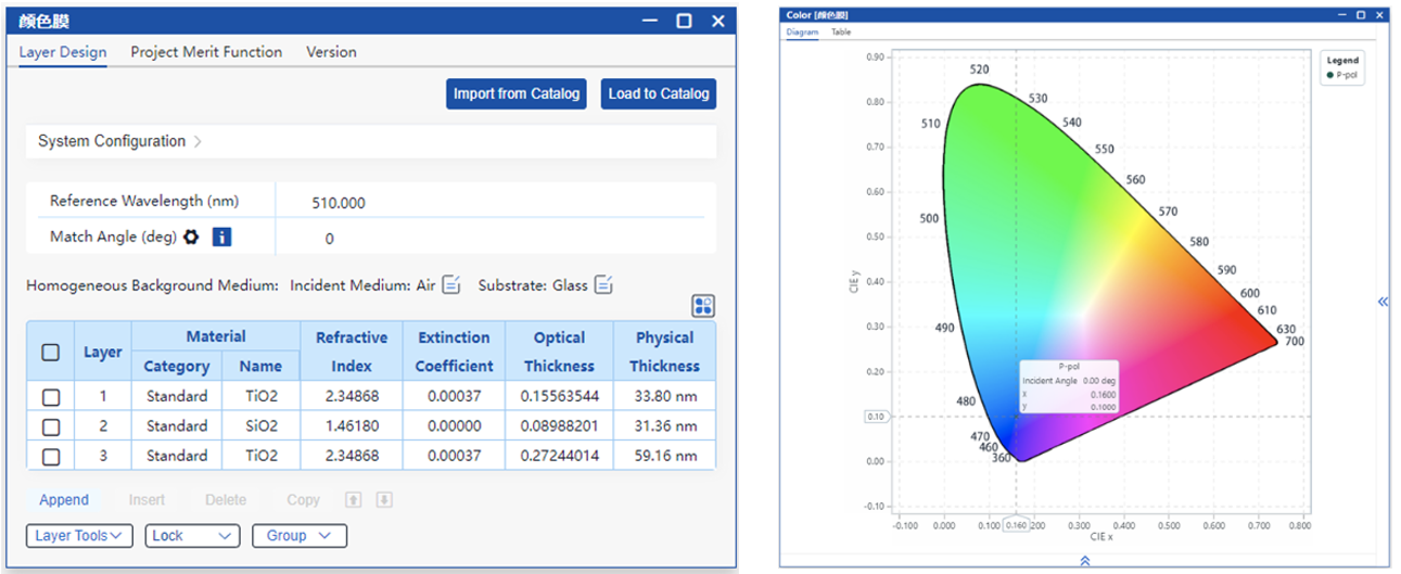 設(shè)計一個顏色膜,通過優(yōu)化初始結(jié)構(gòu)的厚度,目標(biāo)是在0°入射條件下實現(xiàn)反射光色坐標(biāo)嚴(yán)格匹配D65光源下的藍(lán)紫色域(CIE 1931標(biāo)準(zhǔn)),目標(biāo)值為(x,y)=(0.1607,0.1032).