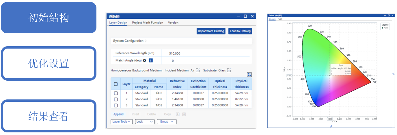 初始結(jié)構(gòu)的反射色見右圖,可以看出此時的反射色接近白色,需進(jìn)一步通過優(yōu)化工具調(diào)整膜厚以實現(xiàn)目標(biāo)顏色值。