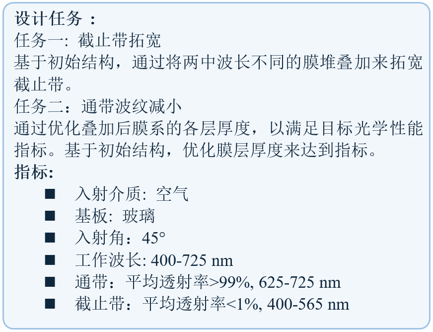 設(shè)計一個反射型青色二向色濾光膜,目標(biāo)是在45°入射時,625-725 nm通帶內(nèi)平均透射率>99%,在400-565 nm截止帶內(nèi)平均透射率<1%.