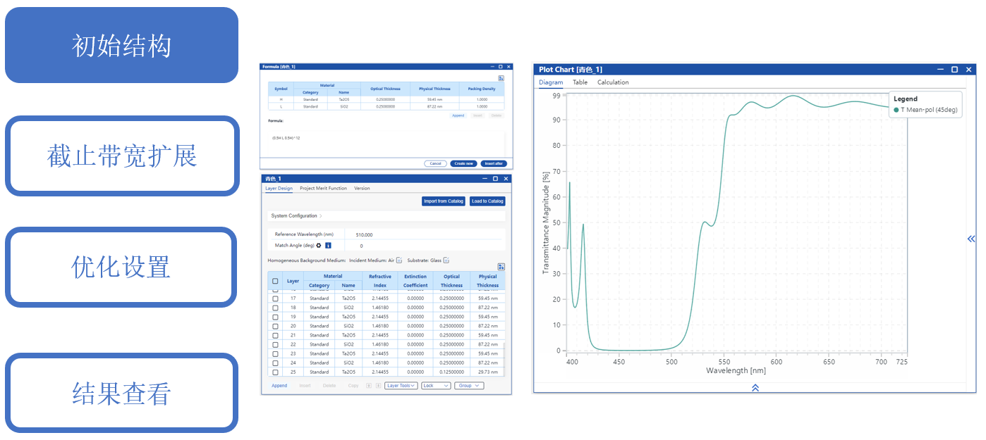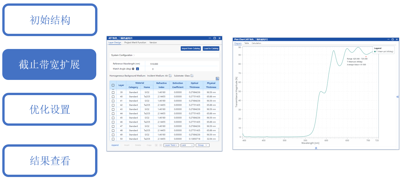 使用公式工具構(gòu)建了上述膜系作為基礎(chǔ)結(jié)構(gòu),右圖展示了其在可見光波范圍內(nèi)45°入射時的光譜?梢钥闯龃藭r通帶波紋較大,截止帶的寬度也不達(dá)標(biāo)。