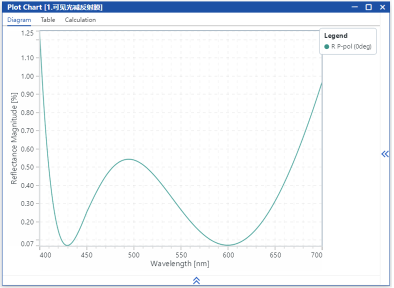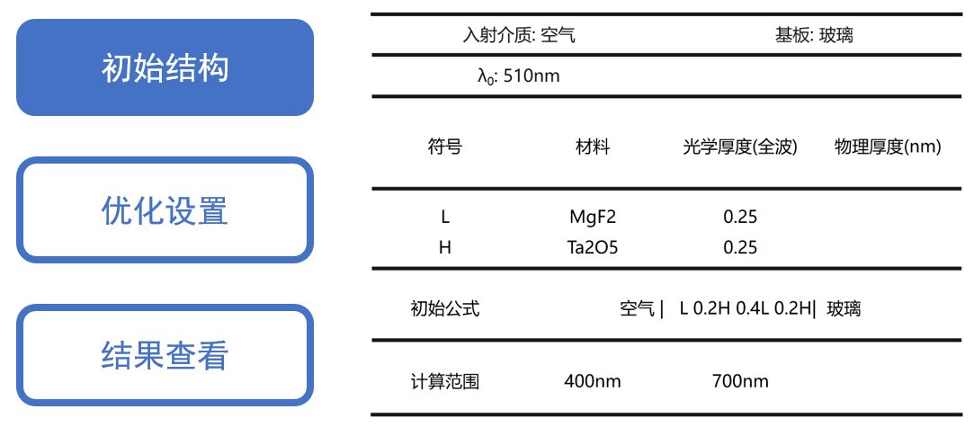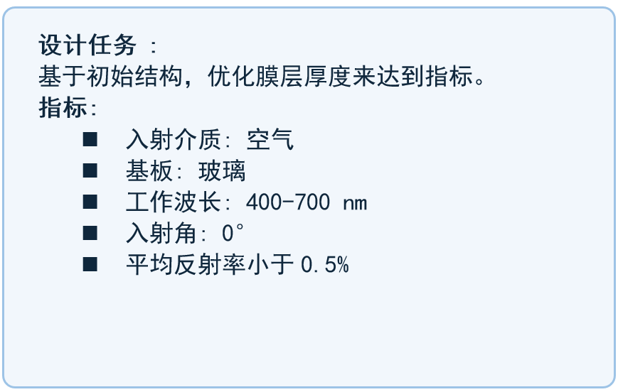 設(shè)計(jì)一個(gè)可見光減反射膜,通過優(yōu)化初始結(jié)構(gòu)的厚度,目標(biāo)是在可見光范圍內(nèi)0°入射條件下實(shí)現(xiàn)平均反射率低于0.5%。