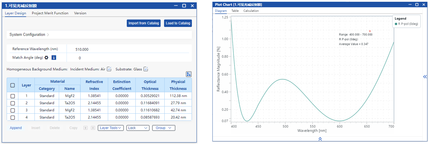 在本應(yīng)用案例中,通過選用成熟的初始結(jié)構(gòu)并對(duì)其厚度進(jìn)行進(jìn)一步優(yōu)化,設(shè)計(jì)出一種在可見光波段具有優(yōu)異減反射性能的鍍膜。