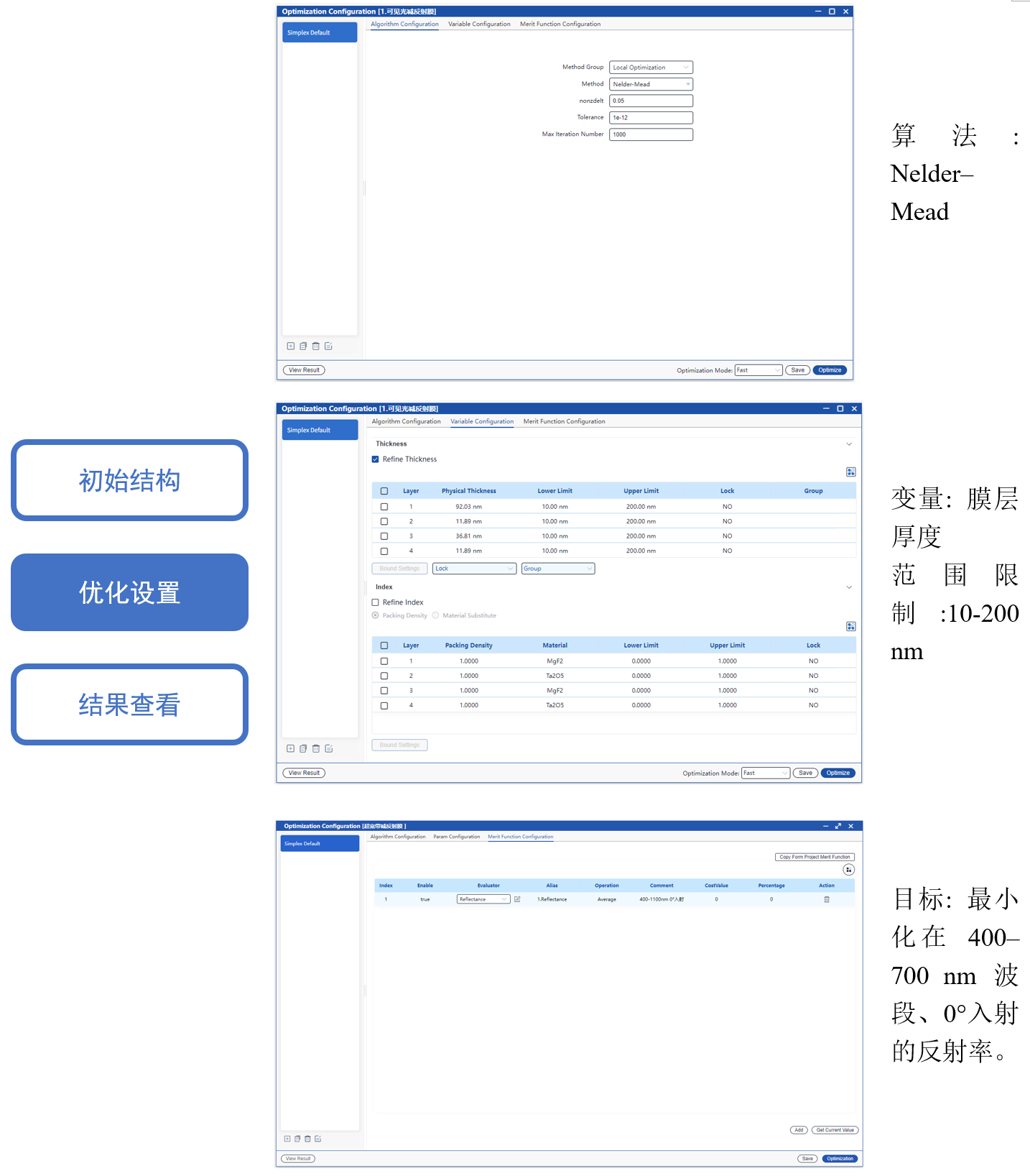 采用 Nelder-Mead 算法對(duì)各層厚度進(jìn)行優(yōu)化,目標(biāo)是在 400–700 nm 波長范圍內(nèi)、0° 入射時(shí)將平均反射率降低至 0.5% 以下。