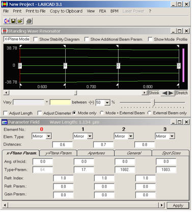 上方的窗口是有4個(gè)元件的簡(jiǎn)單腔的模式圖,下方窗口顯示這個(gè)腔的參數(shù)。在每一個(gè)元件的下面的一列里顯示這個(gè)元件的參數(shù),比如在標(biāo)有“Type-Param”的一例里顯示每個(gè)鏡的曲率半徑。可以用標(biāo)有元件序號(hào)的下拉框按鈕來改變相應(yīng)元件的類型,可以選擇Mirror、Dielectric Interface或者Lens類型。每一元件序號(hào)下面的列顯示相應(yīng)的兩元件的空間屬性,比如折射率、“Refractive Parameter”(表示相應(yīng)的拋物線型折射率分布的二階導(dǎo)數(shù))。關(guān)于這個(gè)窗口的其他功能的描述可以在第3節(jié)、快速入門或者使用手冊(cè)中找到。