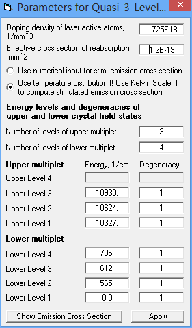 在“Crystal, Pump Beam, and Material Parameters”窗口中打開“Material Parameters”標簽,可以顯示Yb:YAG材料的參數(shù),如圖10所示。在圖10中已勾選“3-level-laser-system”?梢渣c選旁邊的“show material parameters for 3-level-systems”查看能級系統(tǒng)參數(shù),如能級數(shù),再吸收有效十字區(qū)域。