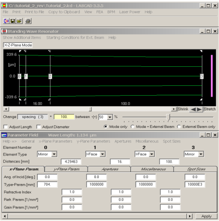 現(xiàn)在你可以看到在頂部的LASCAD的主菜單和在它下面的另外兩個(gè)窗口,一個(gè)標(biāo)題為“Standing Wave Resonator”,另一個(gè)是“Parameter Field”,如圖1所示。上面的窗口顯示了有四個(gè)元件的簡(jiǎn)單腔的模式圖,下面的窗口顯示腔的參數(shù)。在元件編號(hào)下面的縱行顯示的是該元件的參數(shù),比如每個(gè)反射鏡的曲率半徑,在行標(biāo)簽“Type-Param”里顯示。想要改變?cè)愋,可以直接使用元件編?hào)下面的下拉框,你可以選擇反射鏡、介質(zhì)界面和透鏡。元件編號(hào)之間的縱行里顯示的參數(shù)定義了各元件之間的空間的特性,例如折射率,或者由拋物線折射率分布的二次微分導(dǎo)出的“Refractive Parameter”。關(guān)于這個(gè)窗口中其它的功能,例如如何插入或者清除一個(gè)元件,你可以在快速瀏覽第三部分或者手冊(cè)里面找到。