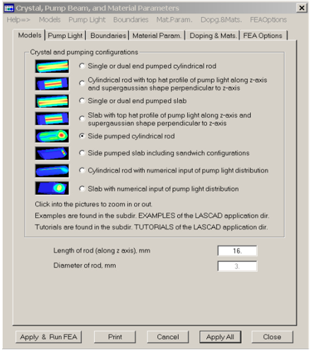 通過(guò)標(biāo)簽“Models”下面的列表可以選擇不同的晶體和泵浦結(jié)構(gòu),我們選擇“Side pumped cylindrical rod”。