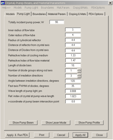 點(diǎn)擊LASCAD主窗口的菜單項(xiàng)“FEA/Parameter Input & Start of FEA Code”,打開(kāi)題為“Crystal,Pump Beam and Materials Parameters”的窗口,如圖2所示。注意六個(gè)標(biāo)簽,用于定義不同類型的參數(shù)。