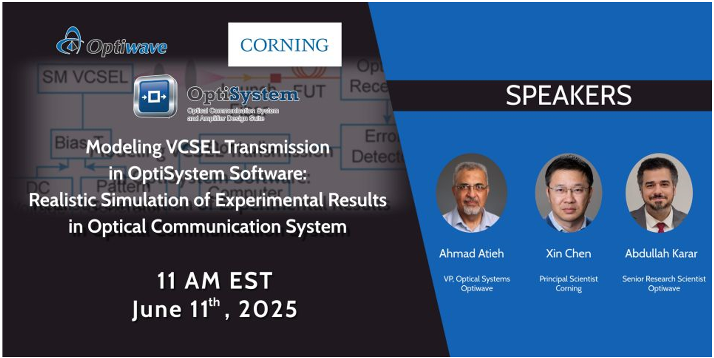 本次網(wǎng)絡(luò)研討會(huì)將展示如何提取實(shí)際VCSEL器件的關(guān)鍵參數(shù)并應(yīng)用于OptiSystem中的器件速率方程建模。內(nèi)容涵蓋康寧公司參考論文中探討的VCSEL啁啾參數(shù)與光纖色散相互作用機(jī)制,及其在OptiSystem工具中的實(shí)現(xiàn)方法?祵幑娟惒┦繄F(tuán)隊(duì)研究的多種光纖類型[1,2]也將作為案例呈現(xiàn)。與會(huì)者將通過實(shí)驗(yàn)數(shù)據(jù)與OptiSystem仿真結(jié)果的對(duì)比分析,深入理解實(shí)際光通信系統(tǒng)的建模技術(shù)。