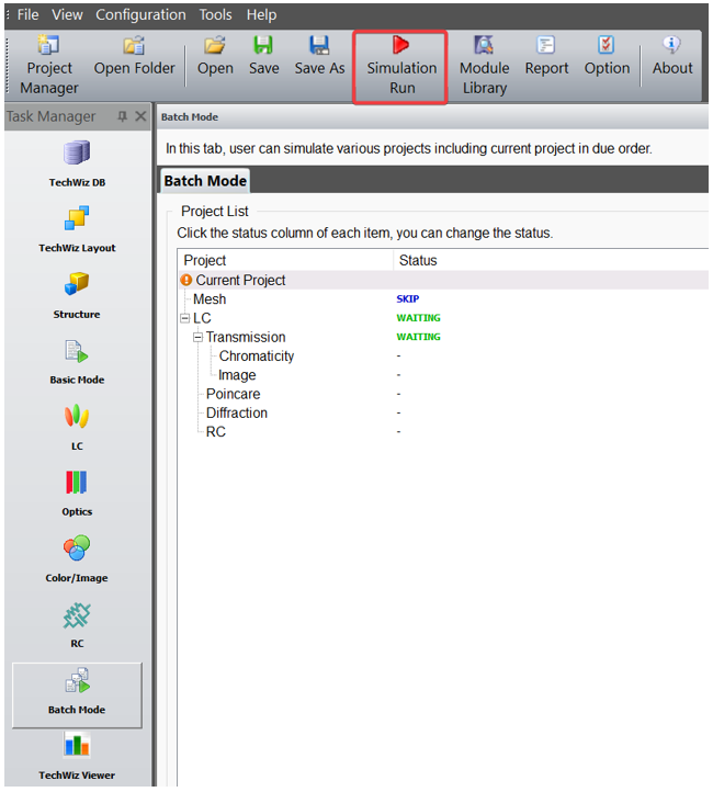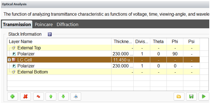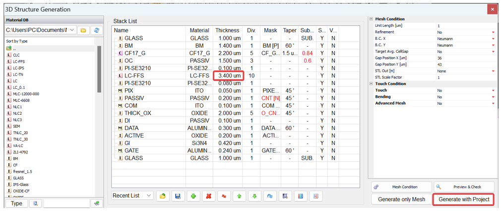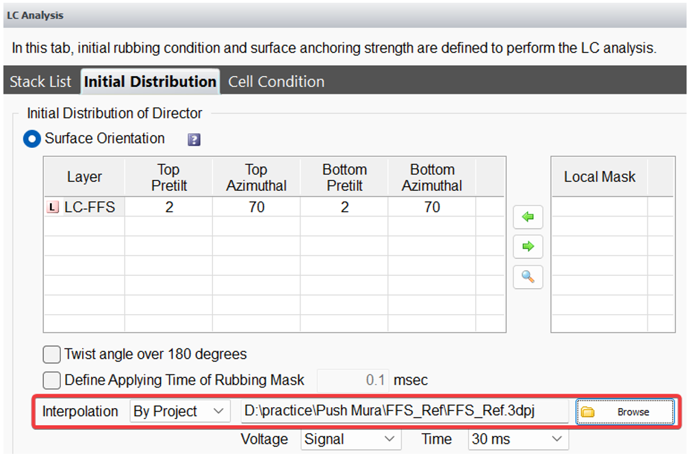 生成3組項(xiàng)目文件,其液晶盒厚(Cell gap)分別為:參考項(xiàng)目和松弛項(xiàng)目為3.4um,按壓項(xiàng)目為2.9um