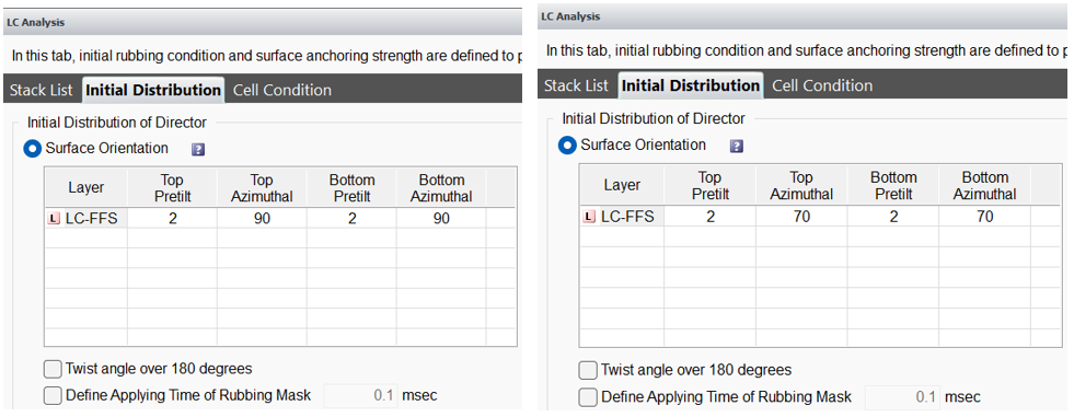 1)液晶初始分布的設(shè)置為:預(yù)傾角全部為2°,參考項(xiàng)目(Ref)和松弛項(xiàng)目(Relaxation)的方位角90°,按壓項(xiàng)目(Push)的方位角為70°,見(jiàn)下圖