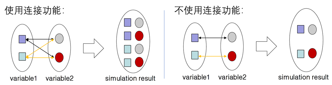 可變量功能(Variable)和連接功能(Link)是可以方便用戶對(duì)于結(jié)構(gòu)中存在變量,以及同時(shí)存在多個(gè)變量時(shí)的仿真,可變量功能可以一次計(jì)算多種仿真條件,從而用戶可以很容易地對(duì)各種條件下的數(shù)據(jù)進(jìn)行比較和分析,而連接功能可以同時(shí)改變兩個(gè)或兩個(gè)以上的條件,在某些數(shù)據(jù)復(fù)雜的情況下可以簡(jiǎn)化數(shù)據(jù),降低運(yùn)算量。其含義解釋可參考下圖