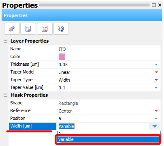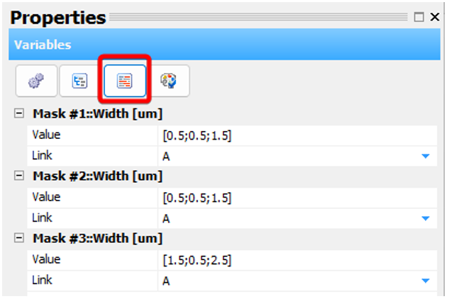 上圖中“Link”符號(hào)一樣的參數(shù)都會(huì)被連接起來(lái),相互連接的參數(shù)需要變量個(gè)數(shù)一致,如“Mask 1”的寬度設(shè)置了三個(gè)變量,則其余連接的掩膜寬度也需要設(shè)置三個(gè)變量