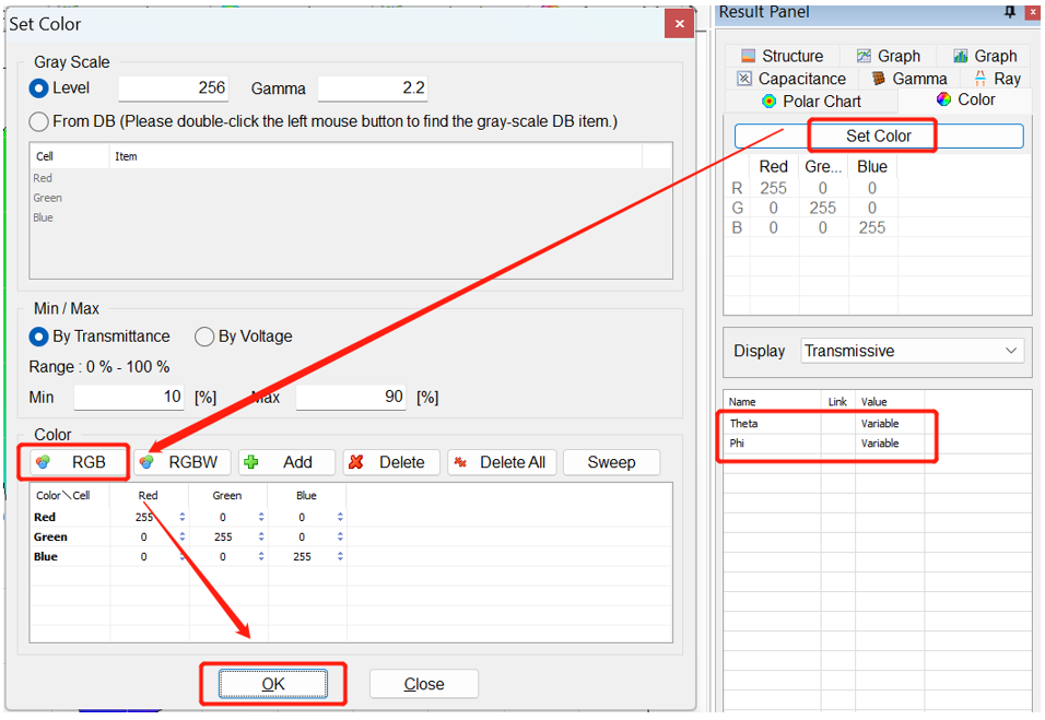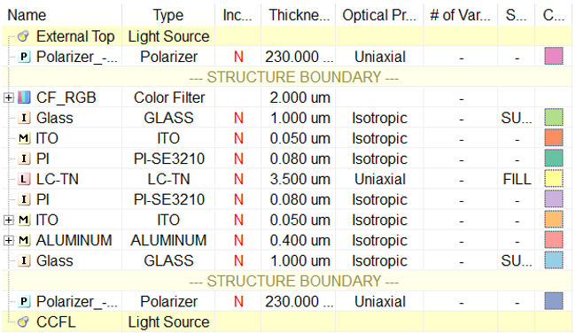 TechWiz LCD 2D可以分析液晶盒的顏色和彩膜(Color-Filter,CF)的特性。對(duì)于RGB三組結(jié)構(gòu)相同的彩膜結(jié)構(gòu),可以使用CF層組來(lái)搭建,對(duì)于RGB三組結(jié)構(gòu)不同的彩膜結(jié)構(gòu),可以使用單層+多疇層組的方式來(lái)進(jìn)行仿真。