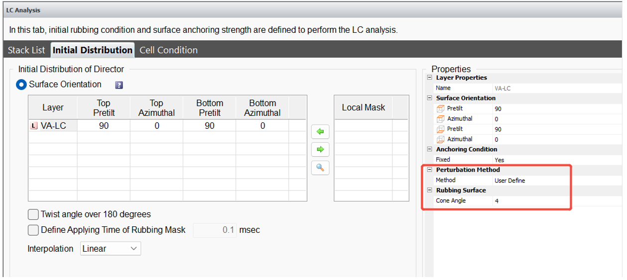 在實(shí)際的摩擦過程中,液晶分子并不是按照摩擦方向均勻排布的,此軟件的微擾法選項(xiàng)(Perturbation Method)允許液晶分子以類似于實(shí)際摩擦過程的方式移動(dòng),當(dāng)使用了微擾方式時(shí),液晶分子在表面取向中指定的摩擦角度相關(guān)的隨機(jī)方向進(jìn)行布。