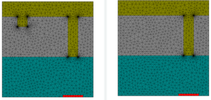 狹縫槽設(shè)置(左)和用于歸一化的狹縫設(shè)置(右)的三角形網(wǎng)格;灰色:銀膜,藍(lán)色:基板,紅色:檢測(cè)器區(qū)域,綠色:空氣;請(qǐng)注意金屬角處網(wǎng)格的預(yù)細(xì)化。