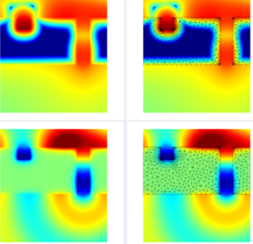 計(jì)算后場(chǎng)強(qiáng)度,有有限元網(wǎng)格部分(右)和沒(méi)有限元網(wǎng)格部分(左)(頂行:  圖 ,底行:   圖 ,偽色標(biāo))。