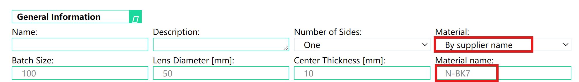 2、若需從主流玻璃供應(yīng)商中選擇特定玻璃型號(hào),請(qǐng)選擇““By suppliers name”并選擇型號(hào),例如N-BK7玻璃: