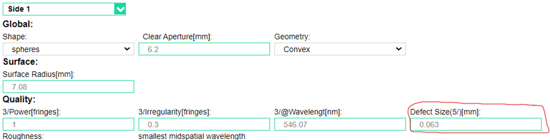 根據(jù)ISO101101標準規(guī)定,允許通過“5/y*x”參數(shù)來定義光學元件側面的最大缺陷尺寸: