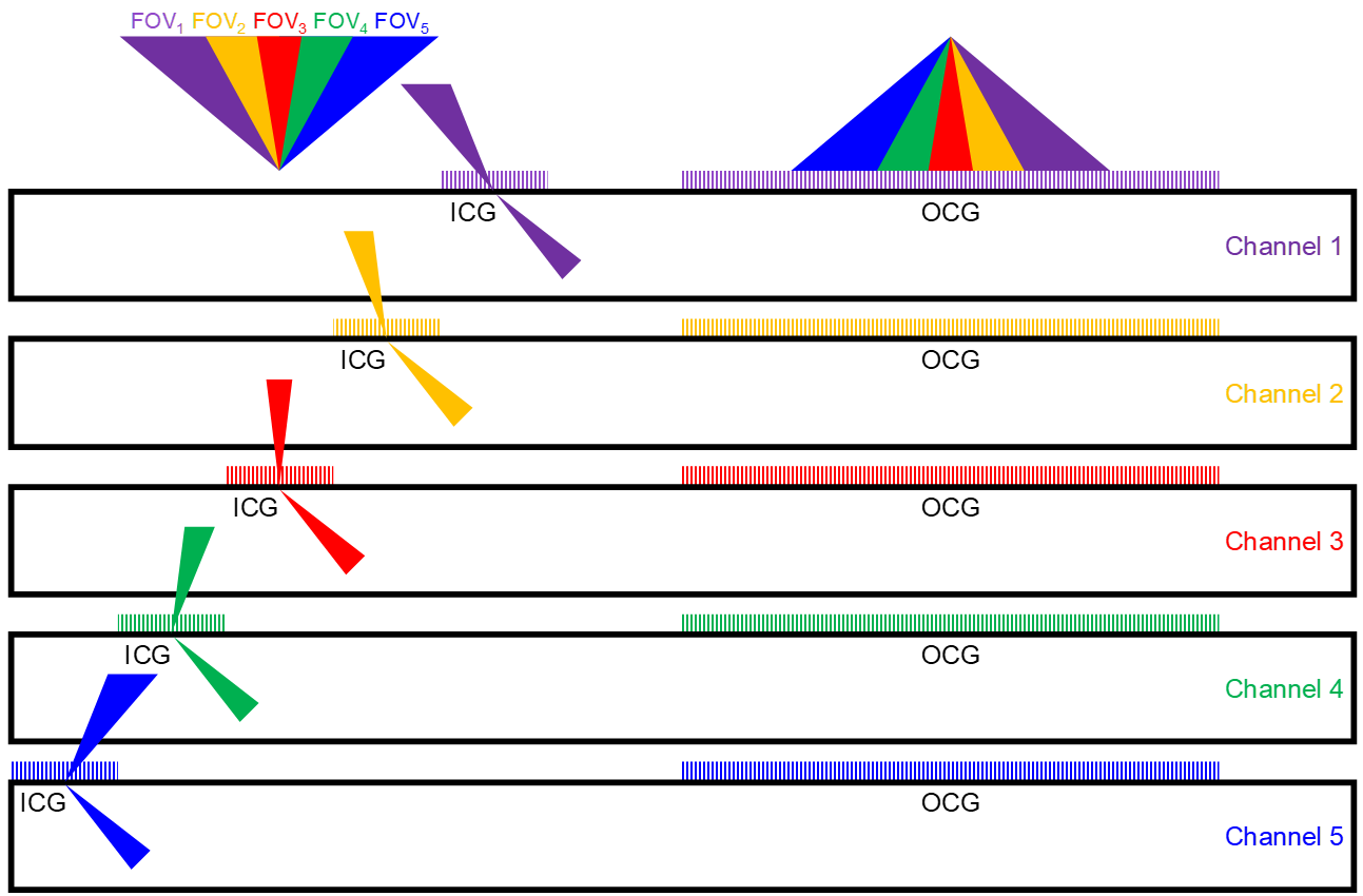 上海交通大學的智能顯示實驗室(sdl.sjtu.edu.cn),提出了一種基于五通道波導及二維擴瞳器的近眼顯示。如圖1所示,其基本架構由(1)五通道波導、(2)入耦合光柵(ICG)、(3)出耦合光柵(OCG)所組成。其核心設計思路為將通道1/2/3/4/5的入耦合光柵置于僅包含子視場1/2/3/4/5的獨立區(qū)域內(nèi),從而實現(xiàn)五通道的視場分割。與傳統(tǒng)波導相比,一個顯著特征是,五個入耦合光柵在位置上是錯開的。