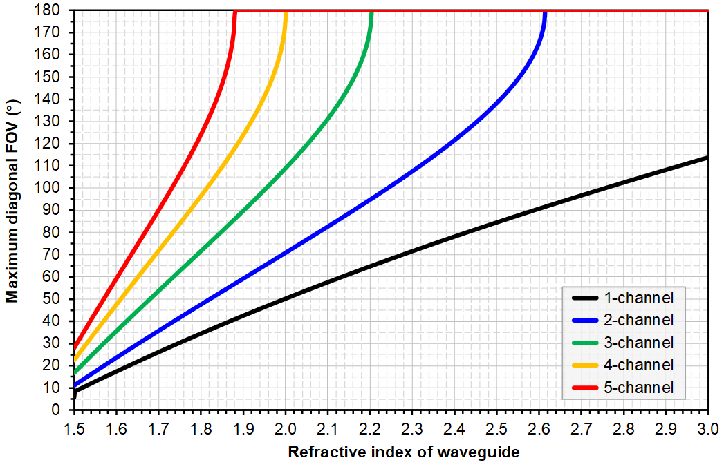 圖2. 單/雙/三/四/五通道波導方案的視場角FOV上限與折射率的關系