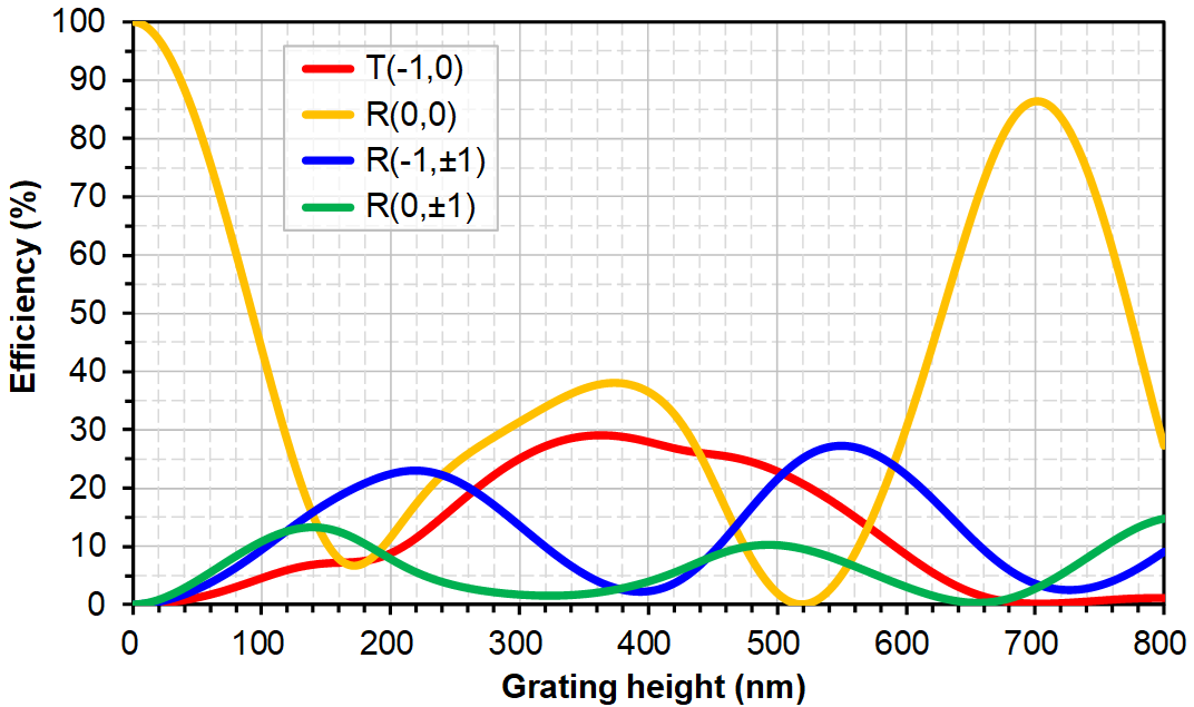 圖4. 二維柱狀光柵的各級衍射級次的效率與光柵高度的關系