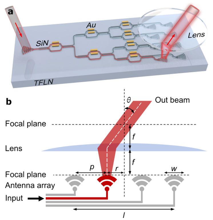 該電光式焦平面陣列芯片由薄膜鈮酸鋰及其上的氮化硅結(jié)構(gòu)構(gòu)成。其中氮化硅被刻蝕為不同的光子集成元件以實現(xiàn)光束的片上耦合和導通,而薄膜鈮酸鋰則依靠其優(yōu)異的電光特性實現(xiàn)光束選通。器件結(jié)構(gòu)如圖1a所示,外部光信號經(jīng)光柵耦合器耦合至氮化硅-薄膜鈮酸鋰芯片上,經(jīng)過多級電光式光開關(guān)陣列之后被選擇性地傳輸至特定光柵輻射器上。如圖1b所示,光柵輻射器陣列位于外置透鏡的焦平面上。光信號經(jīng)不同位置處的光柵輻射器耦合輻射至自由空間,經(jīng)過外置透鏡后產(chǎn)生一個和光柵輻射器位置相關(guān)的偏轉(zhuǎn)角𝜃。通過對電光式光開關(guān)陣列的控制可以選擇性地點亮不同位置處的光柵輻射器,因此可以通過對電光式光開關(guān)陣列的控制可以實現(xiàn)偏轉(zhuǎn)角的快速、低功耗切換(即實現(xiàn)光束掃描功能)。