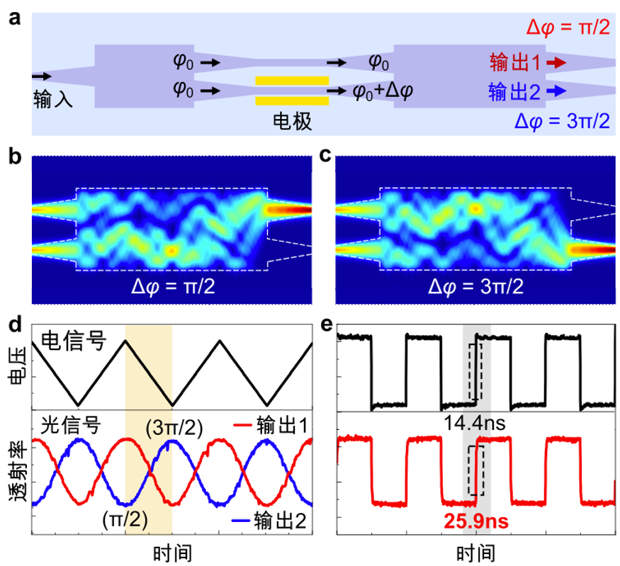 使用的電光式光開關(guān)陣列由多級1×2 MZI(1分2馬赫-曾德爾干涉)光開關(guān)級聯(lián)而成。圖2a為單個1×2 MZI光開關(guān)的結(jié)構(gòu)示意圖,其由一個1×2 MMI(1分2多模干涉)分束器和一個2×2 MMI分束器組成一個雙輸出通道的MZI干涉結(jié)構(gòu)。MZI的一個臂設(shè)有電極,由于其下電光材料薄膜鈮酸鋰的存在,可以通過對電壓的調(diào)節(jié)在該臂上產(chǎn)生一個額外的相位偏移Δφ。兩個不同相位差的光信號進入2×2 MMI之后在多模區(qū)產(chǎn)生干涉。如圖2b和c所示,當兩個輸入光的相位差為π/2時光從上方的輸出通道輸出,當相位差為3π/2時光從下方的輸出通道輸出。而這兩個數(shù)值之外的相位差則使輸入光以一定的比例從上下兩個輸出通道同時輸出,如圖2d所示。因此圖2a所示結(jié)構(gòu)既是一個電光式光開關(guān),同時也是一個主動式任意分束比分束器;诒∧も壦徜噧(yōu)異的電光性能,該器件的開關(guān)速度僅25.9ns(如圖2e所示),實現(xiàn)π相位調(diào)制的功耗僅35.8nJ。因此由其構(gòu)建的焦平面陣列光束掃描芯片在速度和功耗等性能上相比現(xiàn)有熱光式焦平面陣列提升2個數(shù)量級。