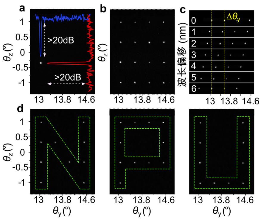 為進行原理驗證,項目組制備了由4級光開關(guān)陣列控制的4×4光柵輻射器陣列,實現(xiàn)了4×4個偏轉(zhuǎn)角的光束掃描。如圖3a所示,輸出光斑圓而亮,橫向和縱向背景噪聲抑制比均大于20dB,顯示了其優(yōu)秀的掃描光斑質(zhì)量。圖3b為逐個點亮4×4光柵輻射器陣列之后輸出光斑的疊加圖。由于較少的輻射器數(shù)目,其光束掃描范圍和精度較為有限。但是其單一方向上的掃描精度可以結(jié)合波長掃描提高。如圖3c所示,通過輸入波長的調(diào)節(jié)可以實現(xiàn)輸出光斑在y方向上的移動,實現(xiàn)y方向上準連續(xù)的光束掃描。此外,由于光開關(guān)陣列同時可以實現(xiàn)任意比例的光功率分配,因此可以選擇性地點亮某些光柵輻射器,實現(xiàn)如圖3d所示的激光投影功能。