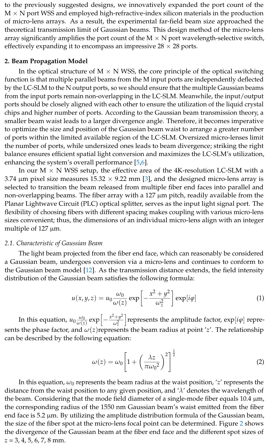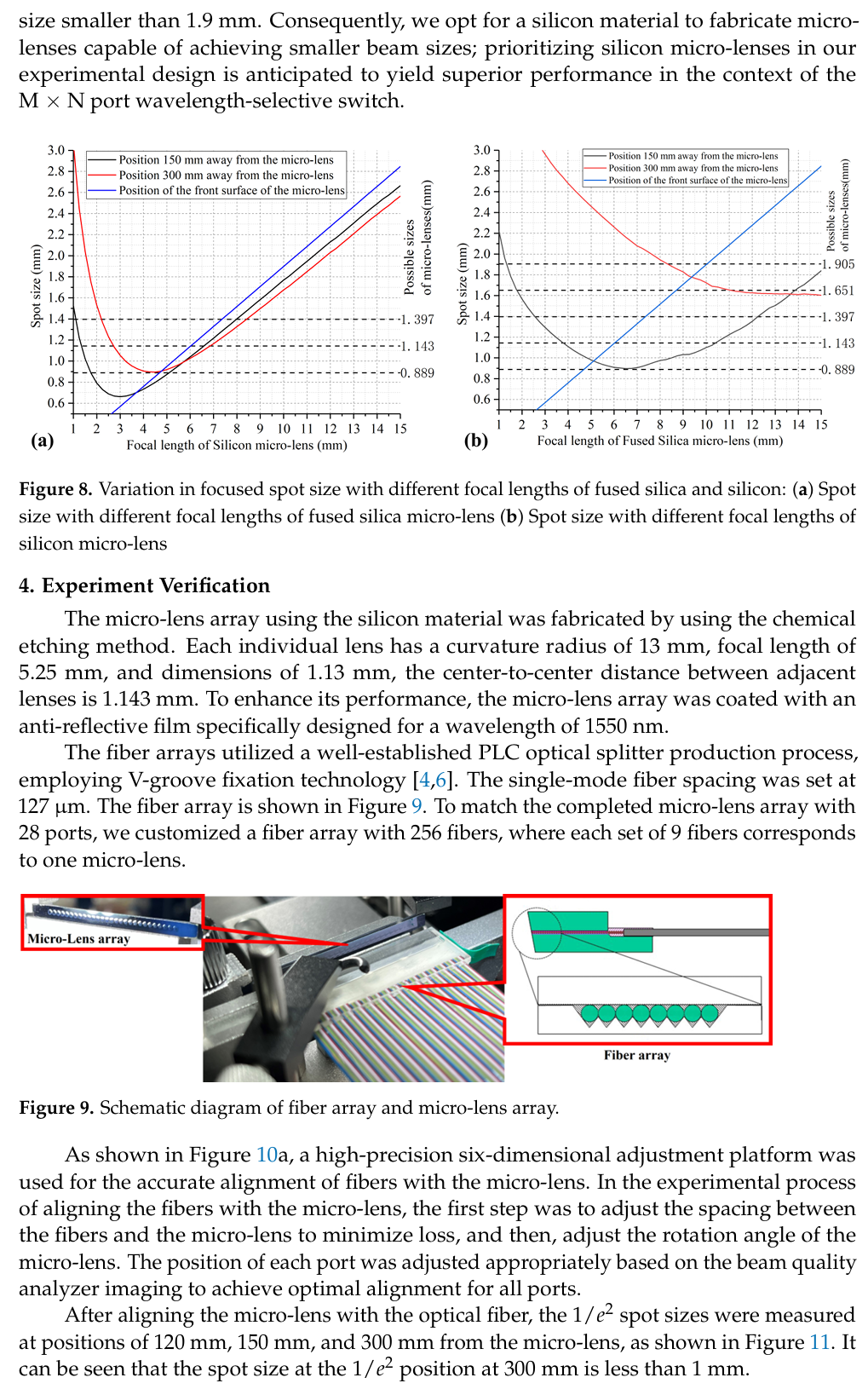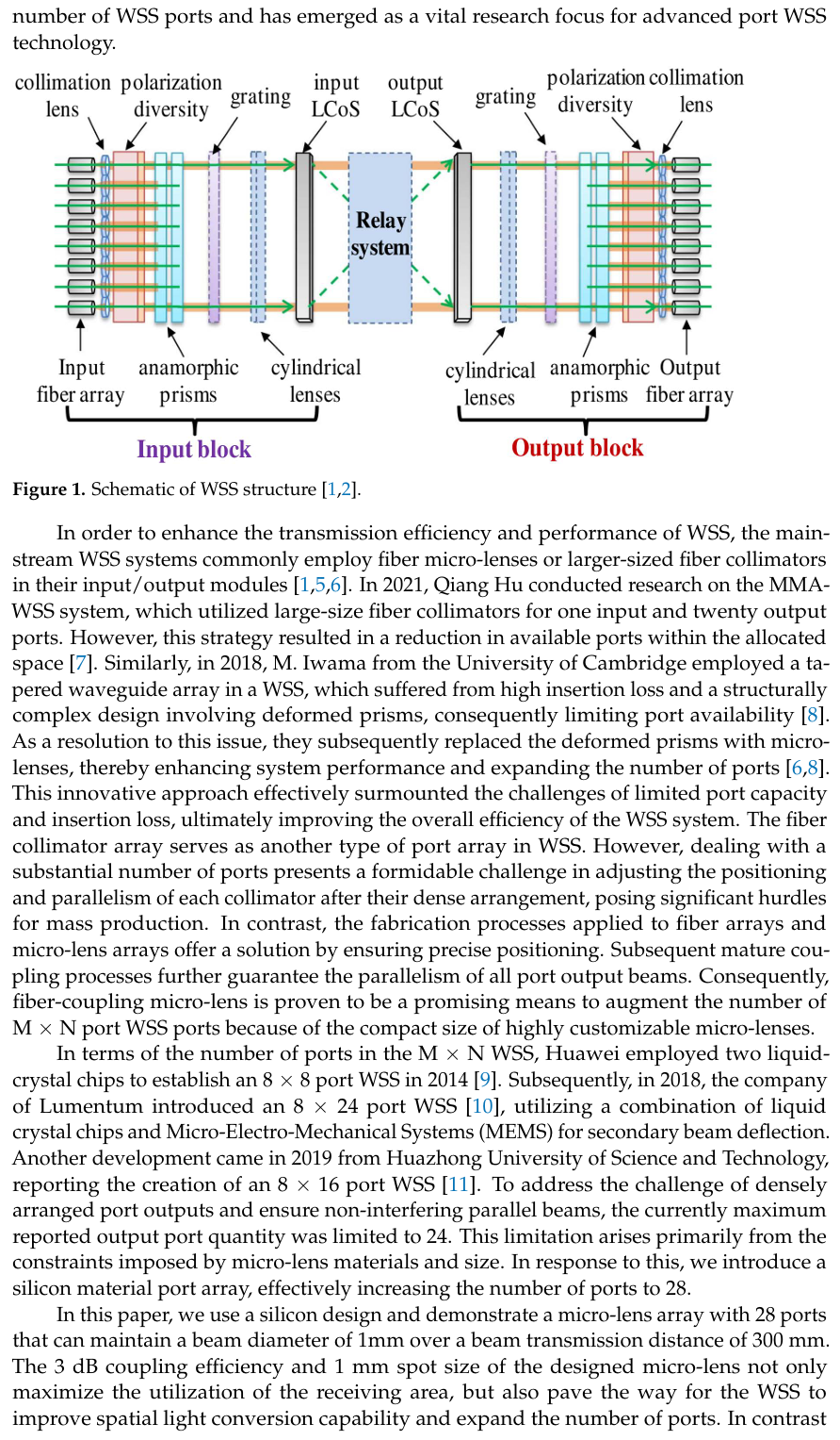 摘要:M×N端口波長選擇開關(guān)(WSS)是光通信系統(tǒng)中可重構(gòu)光分插復用器和光交換節(jié)點的重要器件。其主要功能是通過空間光耦合技術(shù),將多個輸入光信號同時傳輸并切換至輸出光纖端口。WSS中負責將空間光束與光纖耦合的端口陣列模塊,決定了M×N端口WSS的關(guān)鍵參數(shù),如輸入/輸出端口數(shù)量和插入損耗。本文采用強大的物理光學仿真工具VirtualLab Fusion 2023.1(Build 1.558)軟件,設(shè)計優(yōu)化了硅基微透鏡陣列,實現(xiàn)1143 μm間距光纖陣列的高精度耦合。最終,所設(shè)計的微透鏡經(jīng)制造驗證,在3 dB插入損耗條件下展現(xiàn)出優(yōu)異的聚焦能力。該微透鏡陣列耦合系統(tǒng)在傳輸約300 mm距離后,可生成28個直徑約1mm(光束1/e²直徑)的聚焦光斑,顯著擴展了波長選擇開關(guān)的端口數(shù)量。該微透鏡陣列設(shè)計方法顯著提升了M×N端口波長選擇開關(guān)的端口數(shù)量,成功擴展至令人矚目的28×28端口規(guī)模。