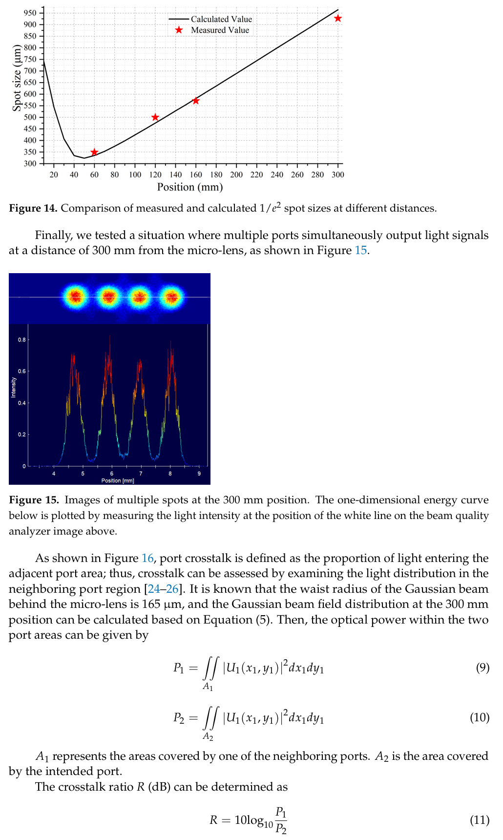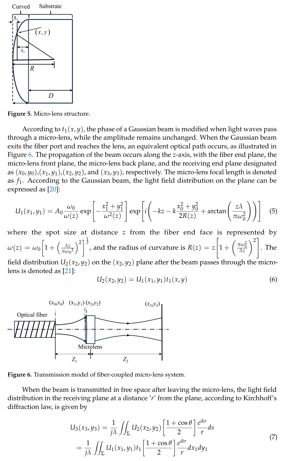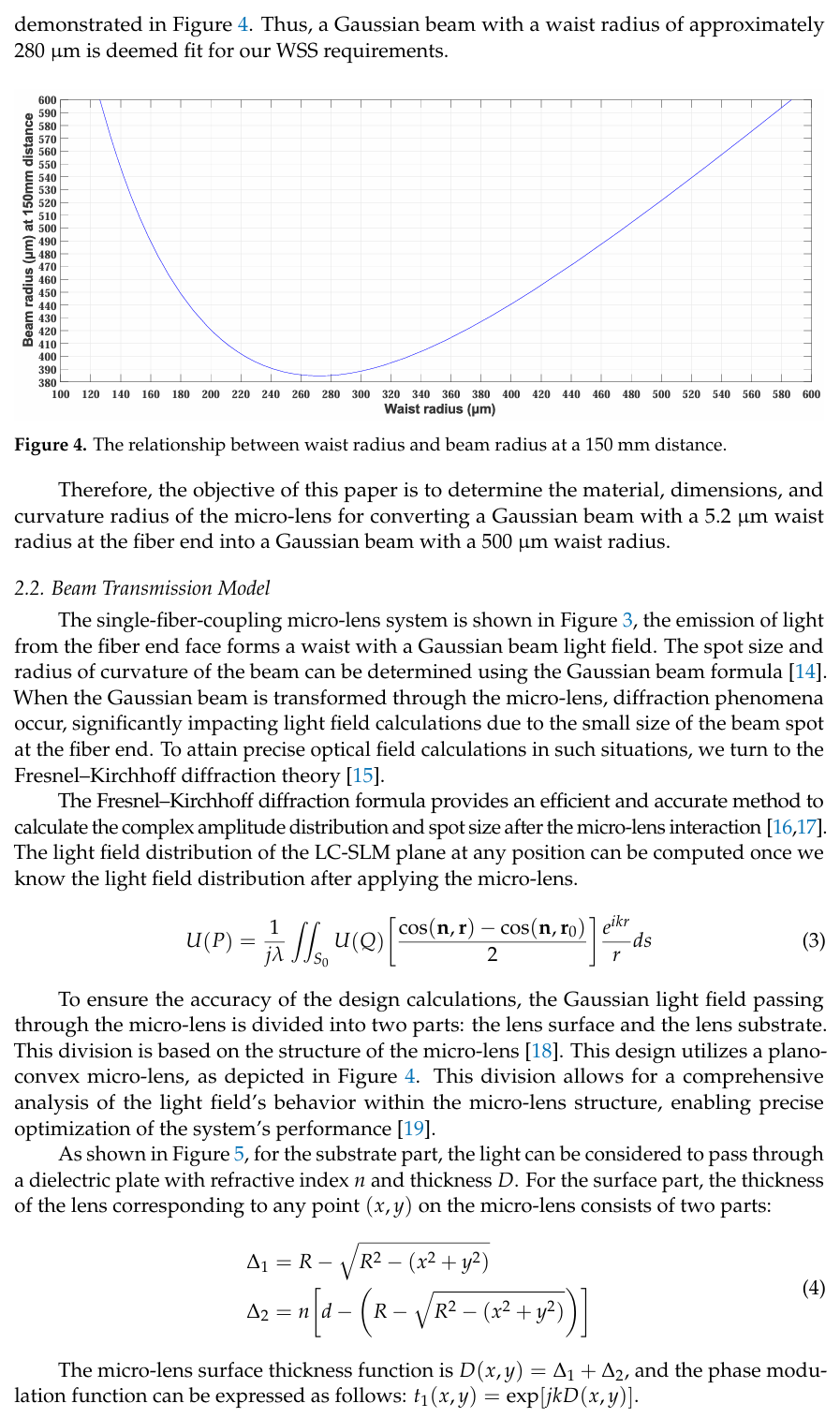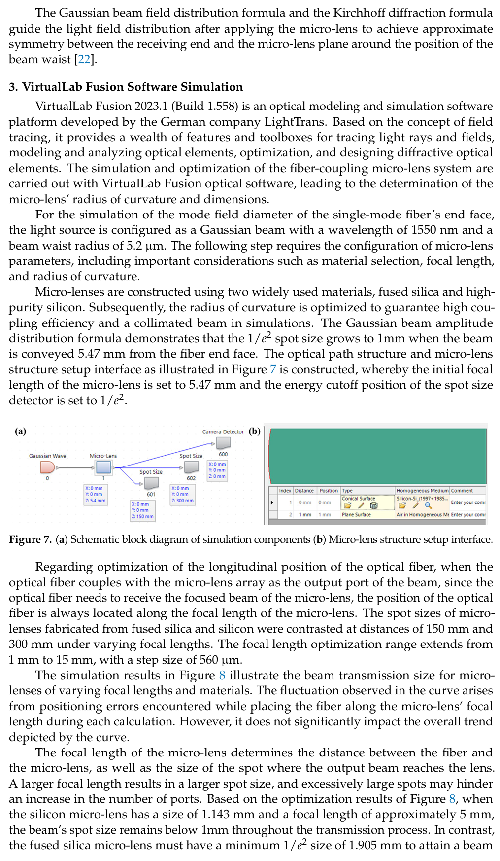 摘要:M×N端口波長選擇開關(guān)(WSS)是光通信系統(tǒng)中可重構(gòu)光分插復用器和光交換節(jié)點的重要器件。其主要功能是通過空間光耦合技術(shù),將多個輸入光信號同時傳輸并切換至輸出光纖端口。WSS中負責將空間光束與光纖耦合的端口陣列模塊,決定了M×N端口WSS的關(guān)鍵參數(shù),如輸入/輸出端口數(shù)量和插入損耗。本文采用強大的物理光學仿真工具VirtualLab Fusion 2023.1(Build 1.558)軟件,設(shè)計優(yōu)化了硅基微透鏡陣列,實現(xiàn)1143 μm間距光纖陣列的高精度耦合。最終,所設(shè)計的微透鏡經(jīng)制造驗證,在3 dB插入損耗條件下展現(xiàn)出優(yōu)異的聚焦能力。該微透鏡陣列耦合系統(tǒng)在傳輸約300 mm距離后,可生成28個直徑約1mm(光束1/e²直徑)的聚焦光斑,顯著擴展了波長選擇開關(guān)的端口數(shù)量。該微透鏡陣列設(shè)計方法顯著提升了M×N端口波長選擇開關(guān)的端口數(shù)量,成功擴展至令人矚目的28×28端口規(guī)模。