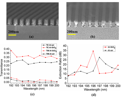 受到微納制作工藝的限制,適用于深紫外波段的亞波長(zhǎng)偏振光柵因周期過(guò)。<20 nm)而無(wú)法被實(shí)際制作出來(lái)。考慮到金屬光柵表面的SPPs只能由TM偏振而無(wú)法用TE偏振激發(fā),我們通過(guò)反復(fù)優(yōu)化光柵結(jié)構(gòu)參數(shù),設(shè)計(jì)并制作了一周期略小于深紫外波長(zhǎng)的金屬鋁柵(圖3. a),TM光會(huì)因SPPs共振被鋁柵表面吸收和反射,而TE光則因?qū)Р9舱癜l(fā)生透射,從而在深紫外波段首次實(shí)現(xiàn)反轉(zhuǎn)偏振透射。隨后,我們利用ALD在光柵縫中共形填充了襯底介質(zhì)-SiO2(圖3. b),通過(guò)增強(qiáng)導(dǎo)波模共振使TE光的平均透過(guò)率提高了40%(圖3. c,d)。