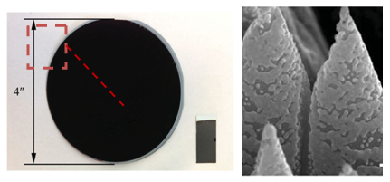 圖4. 黑硅實(shí)物圖及其局部電鏡掃描圖