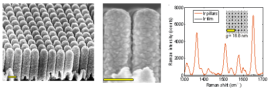圖5. 三維納米金屬柱電鏡掃描圖、局部放大圖及利用該納米柱獲得的分子拉曼光譜